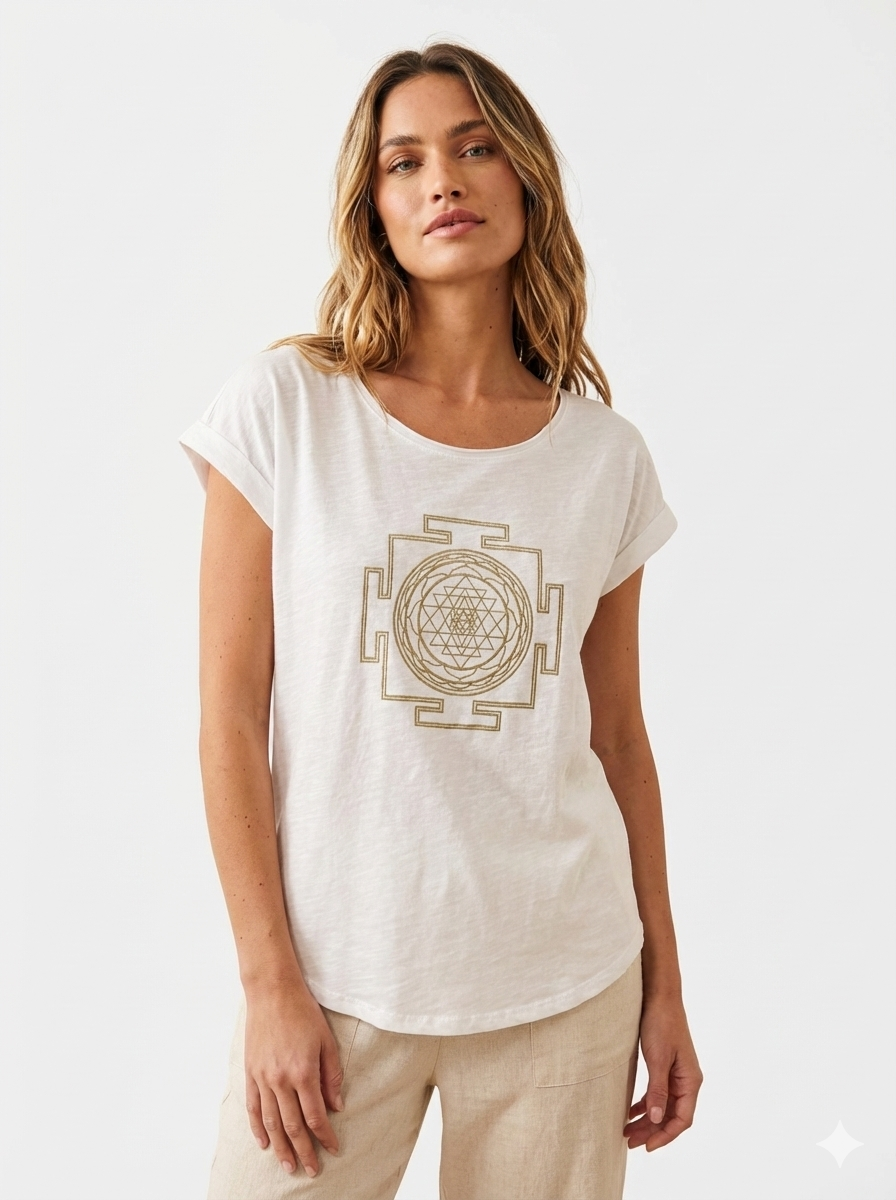 This Sri Yantra Women's T-Shirt features a unique metallic print in golden hues, adding a touch of elegance and spirituality to your style. The lightweight, soft-woven cotton fabric feels exceptional against the skin, while its casual yet feminine cut makes it perfect for any occasion—from your daily look to moments of meditation and wellness.