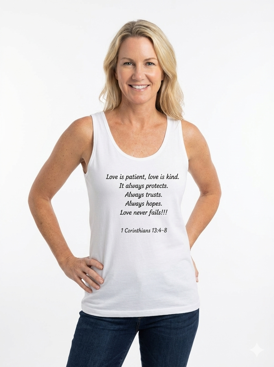 Γυναικείο Μπλουζάκι Ύμνος Αγάπης από τον Απόστολο Παύλο. Δώσε στο στυλ σου ένα μήνυμα ελπίδας, πίστης και αγάπης με αυτό το μοναδικό γυναικείο αμάνικο μπλουζάκι, εμπνευσμένο από την Α’ Κορινθίους 13:4-8, ένα από τα πιο όμορφα αποσπάσματα για την αγάπη.